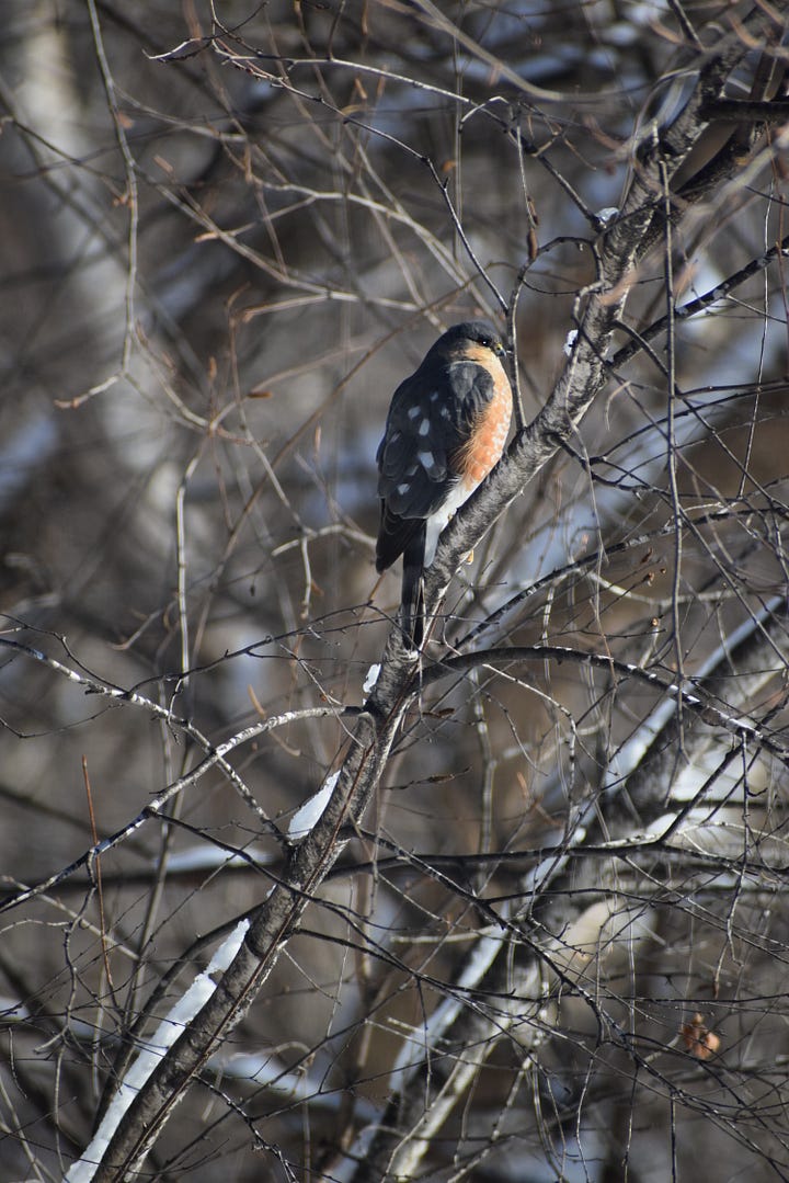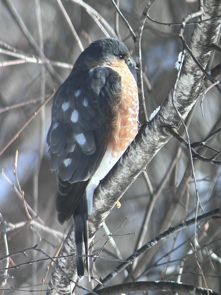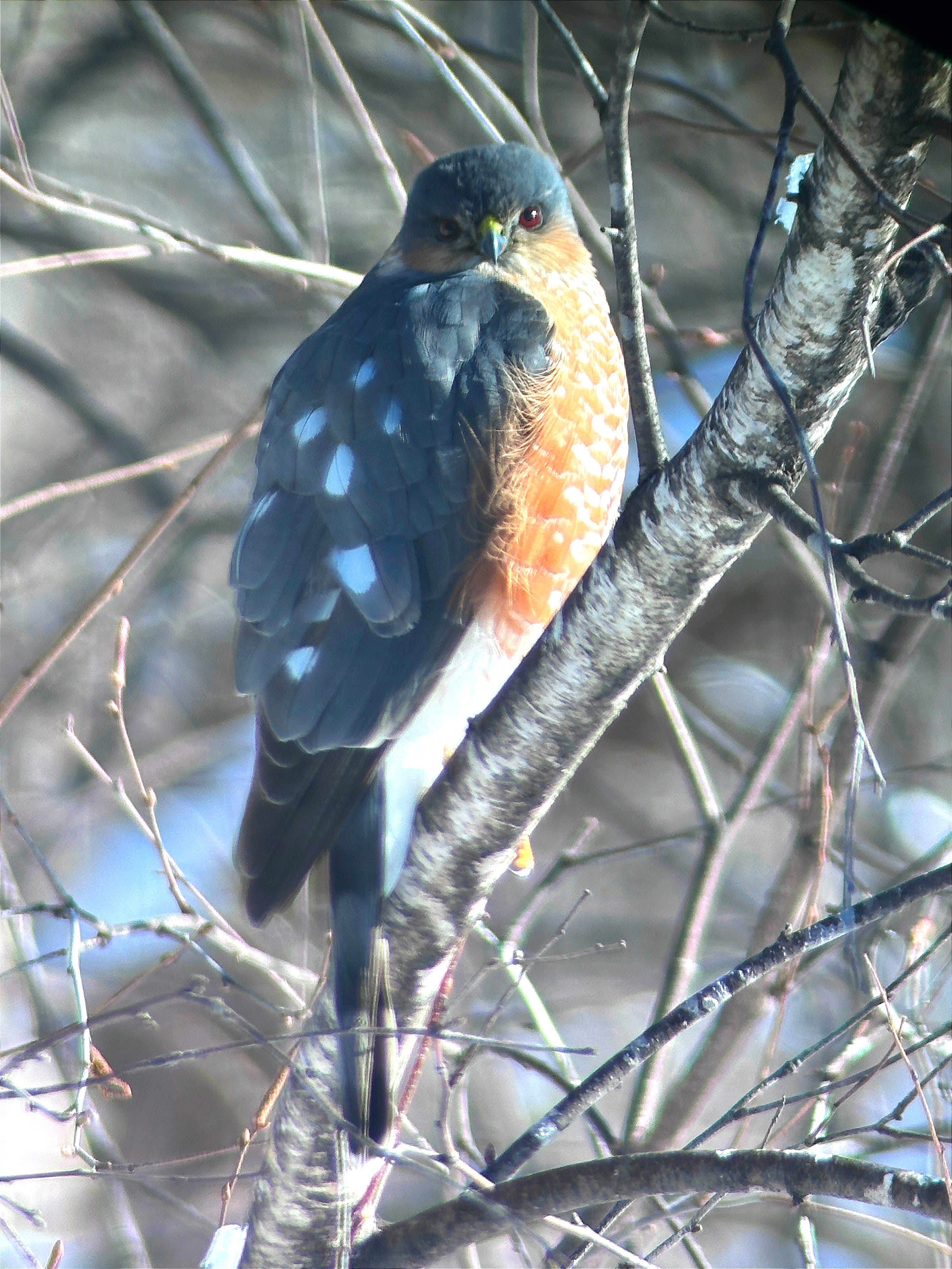 Yesterday I noticed my resident Sharp-shinned Hawk sitting still in a birch tree waiting to catch an unsuspecting feeder bird passing by. The hawk allowed me to set up my new scope for its first try at what is called digiscoping - attaching a digital camera to a telescope in order to produce a super telephoto shot.