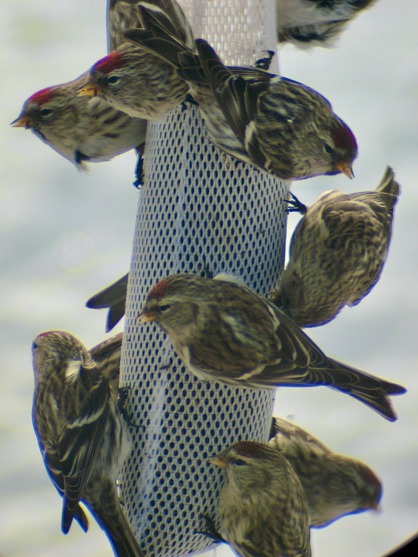 Because this type of seed is small, there are specialized feeders called “thistle” or “finch” feeders. I happen to like the Droll Yankee Ring Pull Finch Feeder which has nice feeding ports and the “ring pull” design makes cleaning the feeder a breeze. If you get a fair amount of goldfinches, having a larger feeder like the Droll Yankees 36 inch New Gen Tube Feeder will attract many at once. This feeder is also easy to clean and the polycarbonate tube keeps the seed dry. There are inexpensive mesh feeders that work well but the seed can spoil as the mesh does not kept it completely dry. I like using mesh feeders in the middle of winter when we normally don’t get rain. Common redpolls, which visit in large flocks, like hanging off the mesh in numbers.