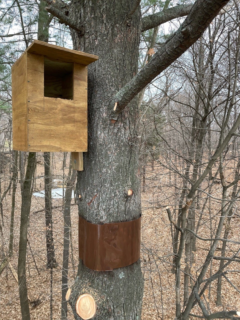 Barred owls begin nesting in March, about a month later than great horned owls. They are cavity nesters, nesting in hollow trees or nest boxes. Usually 2 to 3 eggs are incubated for a month and the owlets leave the nest 4 to 5 weeks after hatching. Like the great horned, the barred owl parents will continue to feed the owlets in the woods for months over the summer.